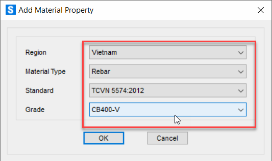 Tương tự, chọn: Region: Vietnam → Material Type: Rebar → Standard: TCVN 5574-2012 → Grade: CB400-V (hoặc loại thép khác).