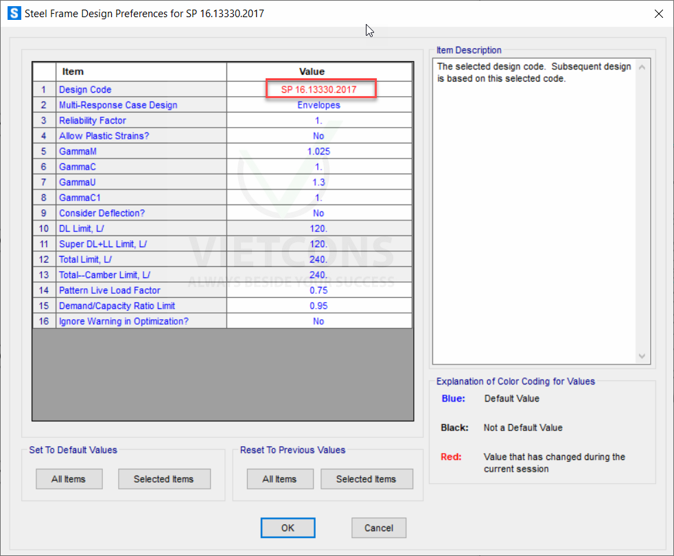 Vào: Design > Steel Frame Design > View/Revise Preferences.