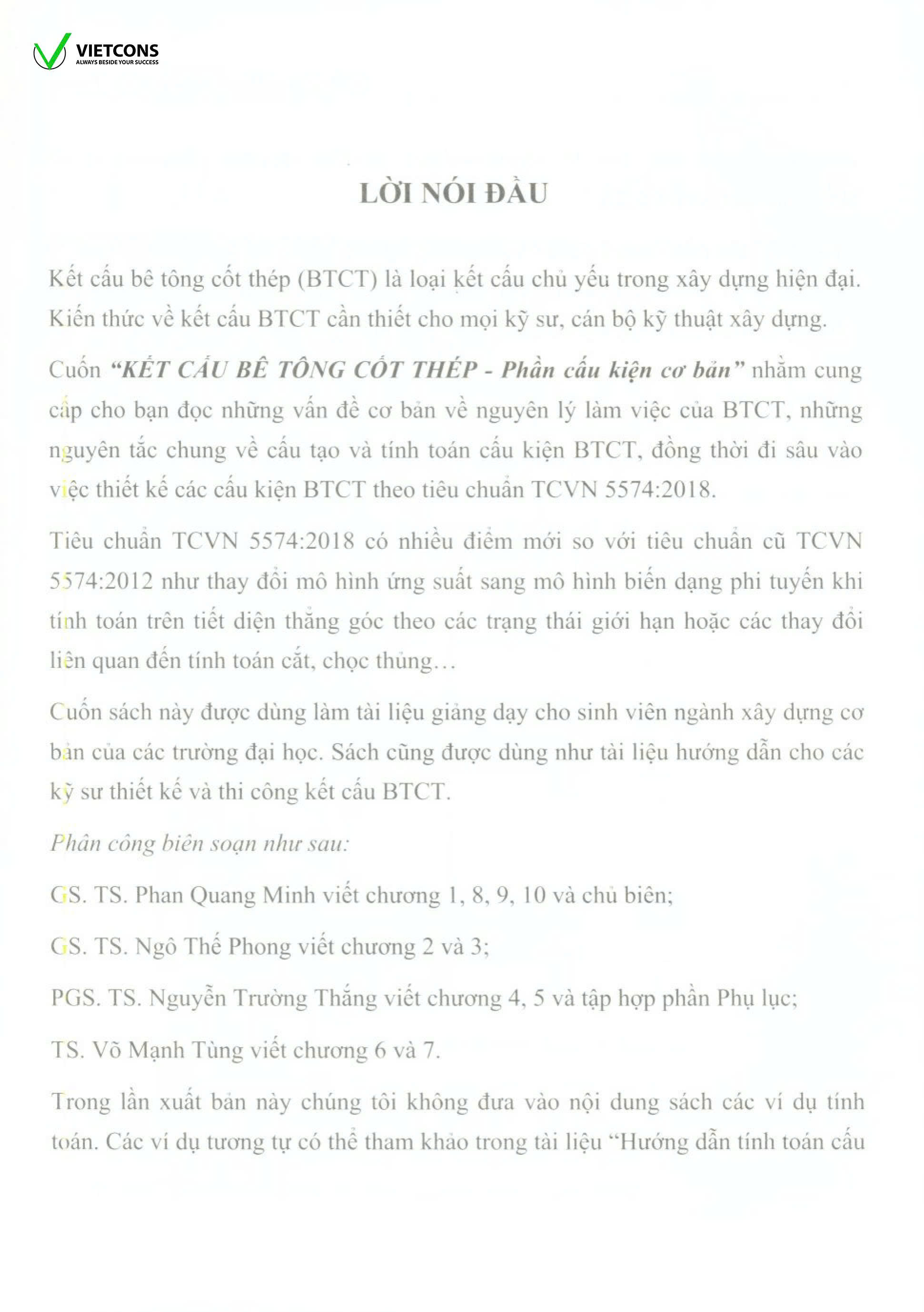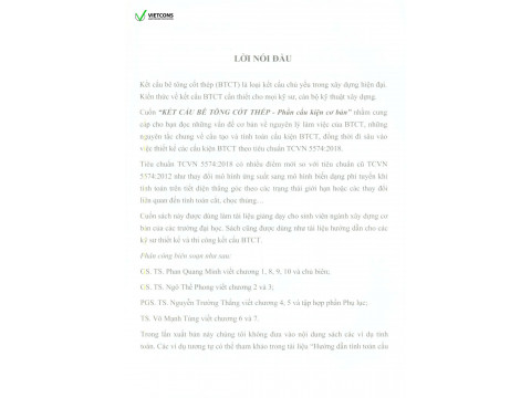 Cuốn sách nhằm cung cấp cho bạn đọc những vấn đề cơ bản về nguyên lý làm việc của Bê tông cốt thép BTCT, những nguyên tắc chung về cấu tạo và tính toán cấu kiện BTCT, đồng thời đi sâu vào việc thiết kế các cấu kiện BTCT theo tiêu chuẩn TCVN 5574:2018. Tiêu chuẩn TCVN 5574:2018 có nhiều điểm mới so với tiêu chuẩn cũ TCVN 5574:2012 như thay đổi mô hình ứng suất sang mô hình biến dạng phi tuyến khi tính toán trên tiết diện thẳng góc theo các trạng thái giới hạn hoặc các thay đổi liên quan đến tính toán cắt, chọc thủng,…cuốn sách là tài liệu giảng dạy cho sinh viên ngành xây dựng cơ bản của các trường đại học. Sách cũng được dùng như tài liệu hướng dẫn các kỹ sư thiết kế, thi công kết cấu BTCT.